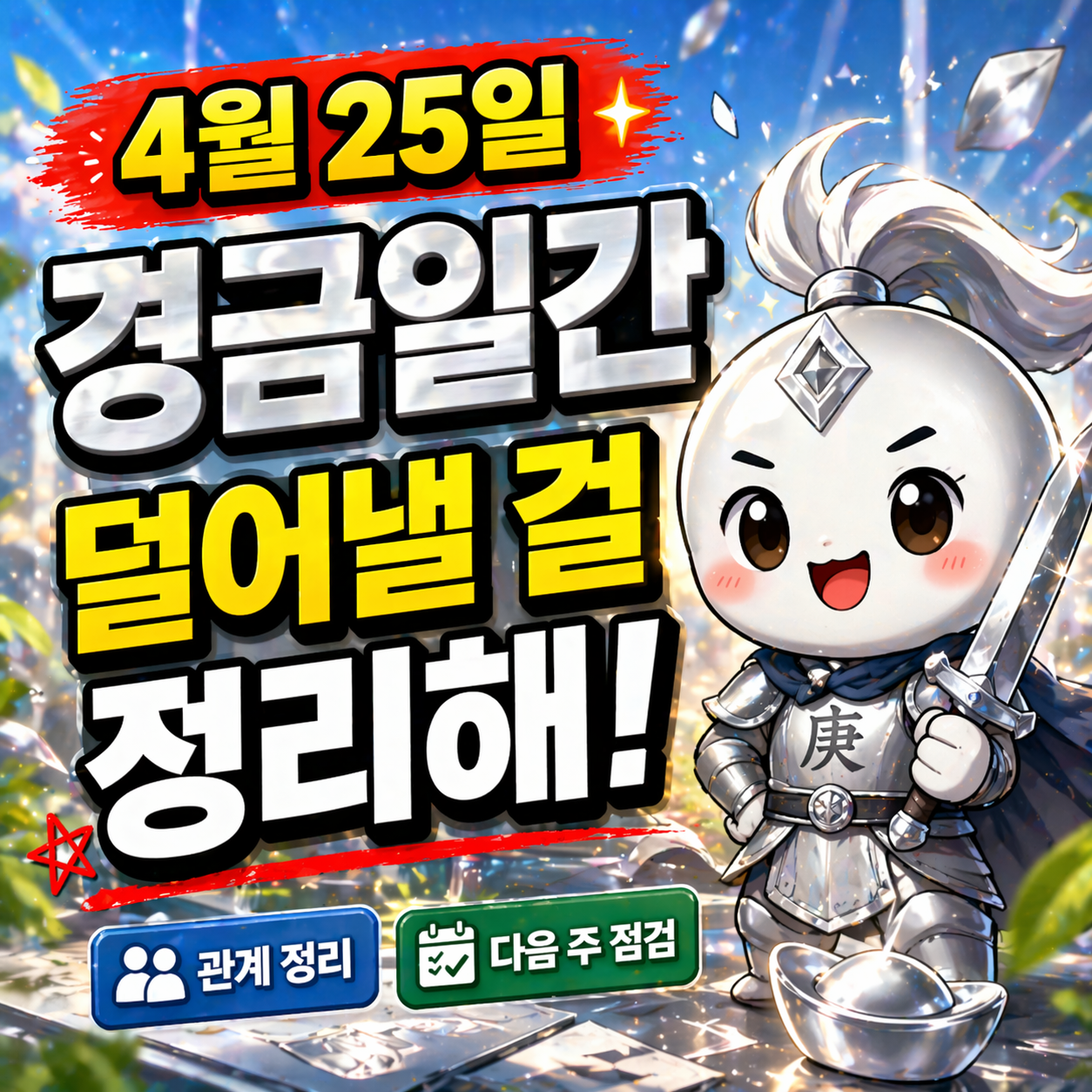 오늘은 2026년 4월 25일 경금일간을 기준으로 하루의 흐름을 풀어 보겠습니다. 경금일간은 사주 앱이나 만세력에서 태어난 날을 계산했을 때 일주가 경자, 경인, 경진, 경오, 경신, 경술 중 하나로 나오는 사람을 말합니다. 즉 단순히 띠나 태어난 해로 정해지는 것이 아니라, 출생한 연월일시를 60 갑자 방식으로 계산했을 때 태어난 날의 첫 글자가 ‘경(庚)’으로 나오는 경우에 해당합니다. 명리학에서 경금은 양금에 속하며, 신금처럼 세밀하게 다듬어진 금속이라기보다 큰 쇠붙이, 원석, 칼의 뼈대처럼 분명하게 가르고 버티는 기운으로 해석하는 경우가 많습니다. 그래서 오늘은 무엇을 더 붙잡을지보다, 무엇을 이제는 덜어내야 하는지가 더 선명하게 보일 수 있습니다.